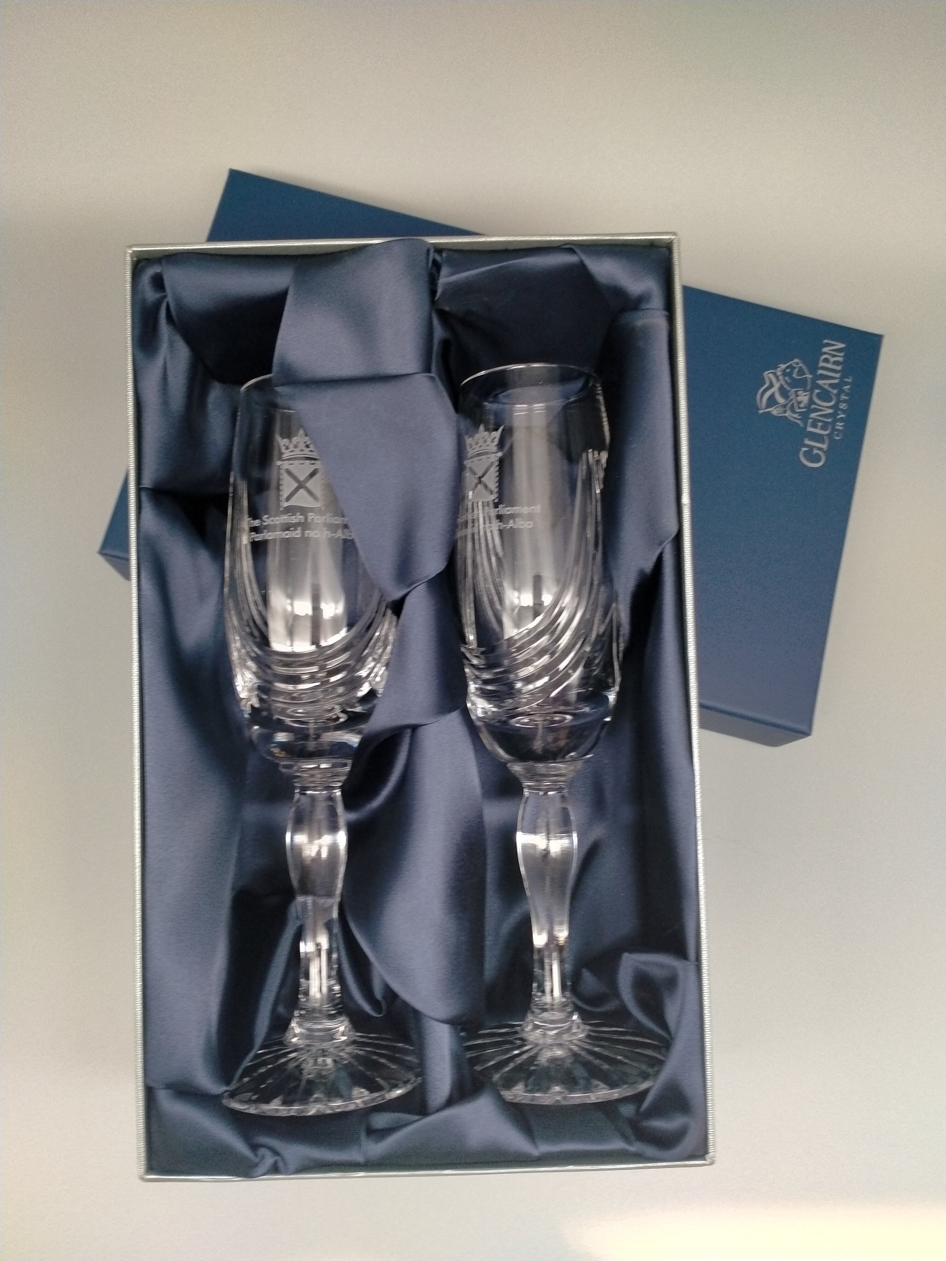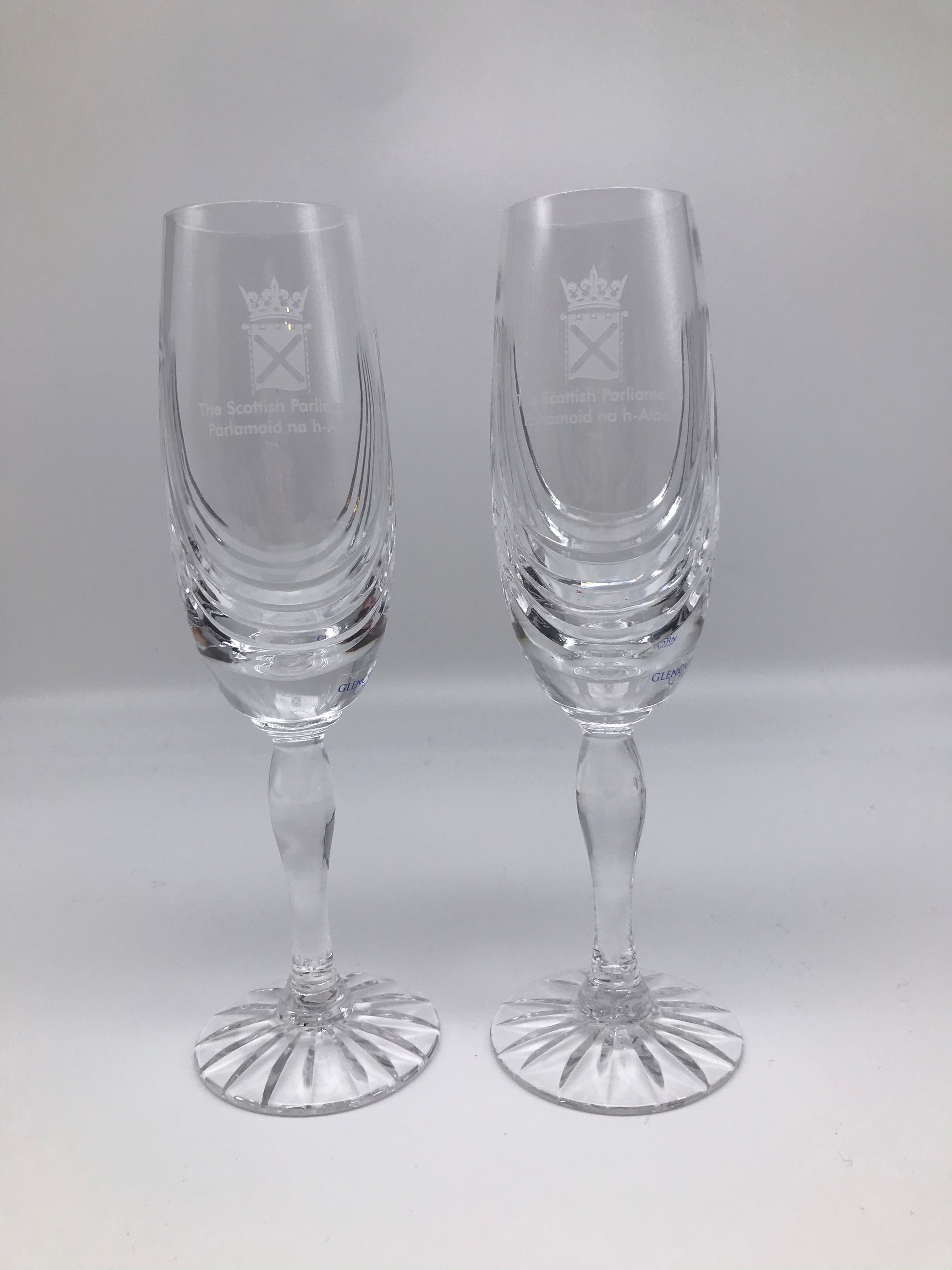 A pair of 24% lead crystal champagne flutes, mouth blown, hand cut and hand polished. They are engraved with the Scottish Parliament symbol. Sold as a pair in an attractive presentation box, making them an ideal gift to mark a special occasion.